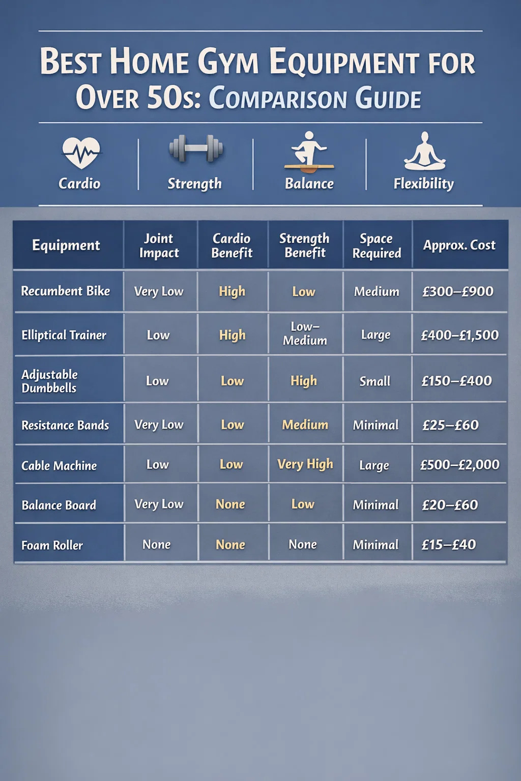 Dies ist das umfassendste Setup für über 50-Jährige und deckt alle vier Säulen ab – Cardio, Kraft, Gleichgewicht und Flexibilität –, ohne dass ein spezieller Raum oder eine komplexe Installation erforderlich ist.