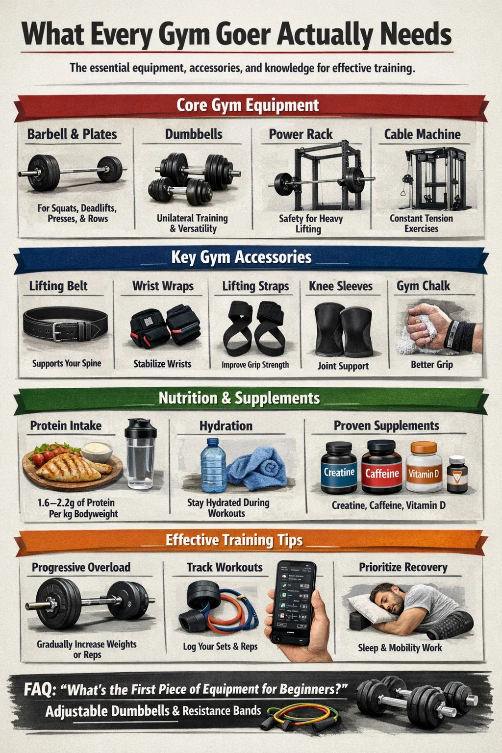 In diesem Leitfaden wird alles, was ein Fitnessstudio-Besucher braucht, in praktischer und spezifischer Form aufgeschlüsselt. Keine vagen Ratschläge zum Thema „Motiviert bleiben“. Nur ein klarer Blick auf die Ausrüstung, das Zubehör, die Gewohnheiten und das Wissen, die Menschen, die sich tatsächlich verbessern, von denen unterscheiden, die monatelang ihr Rad drehen.