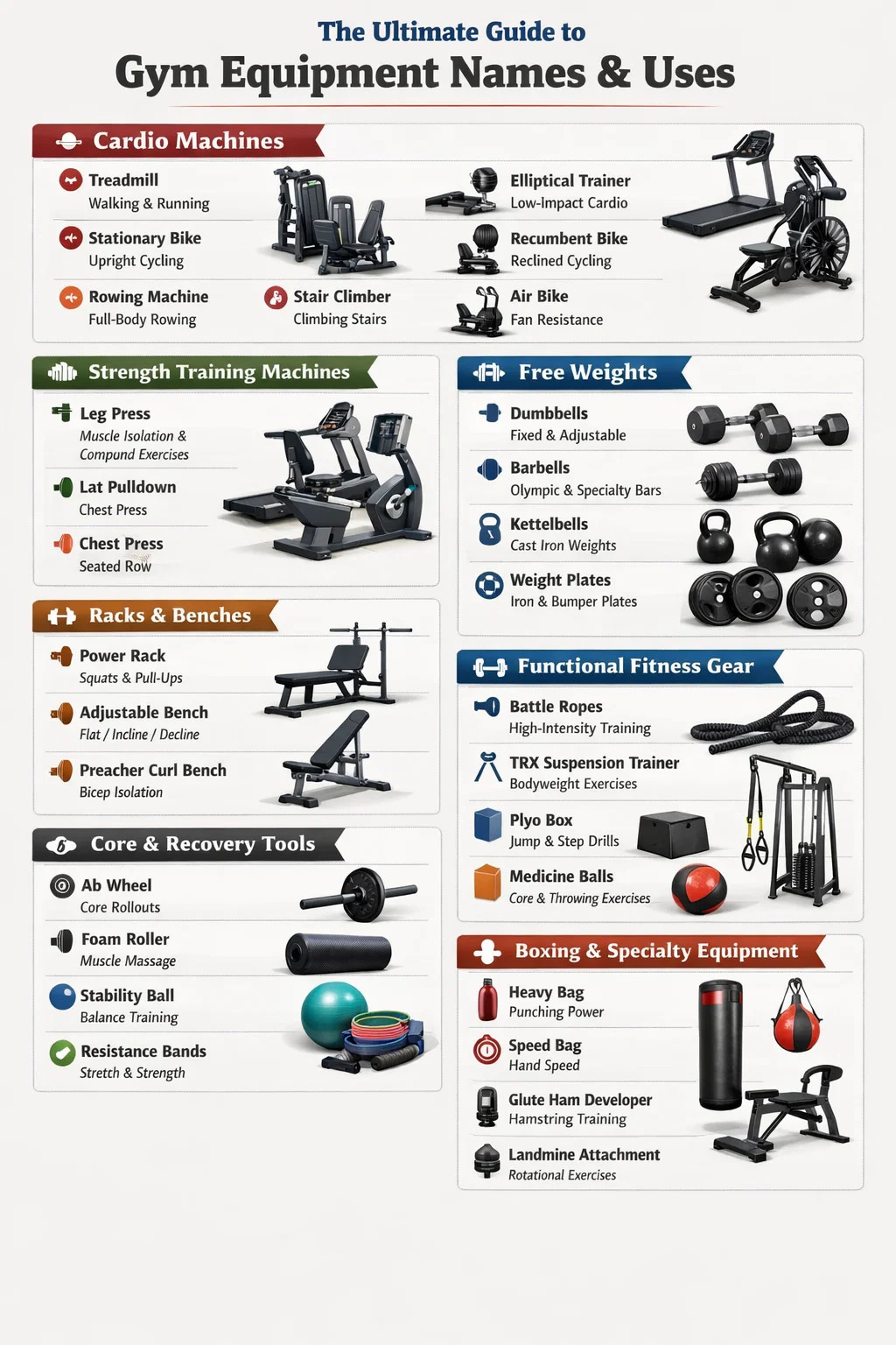 Egal, ob Sie ein Heim-Fitnessstudio bauen, in einem kommerziellen Fitnesscenter anfangen oder einfach nur versuchen, die Terminologie vor Ihrer ersten Sitzung mit einem Personal Trainer zu erlernen: Das Verständnis der Namen und Funktionen von Fitnessgeräten ist der erste Schritt, um sie sicher und sicher zu nutzen.